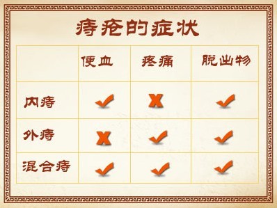 痔块脱垂:常是晚期症状,多先有便血后有脱垂。初始只在大便时脱垂,便后可自行回复,后发展为需用手推回,更严重者是稍加腹压即脱出肛外。